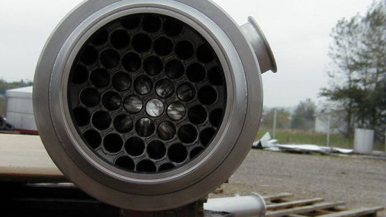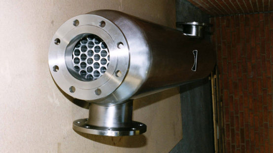 - The product runs into a number of smaller tubes. Product pipes are welded at both ends of a larger tube in which the service media runs. The exact design conditions are tailored to provide maximum heat drop for a given pipe size